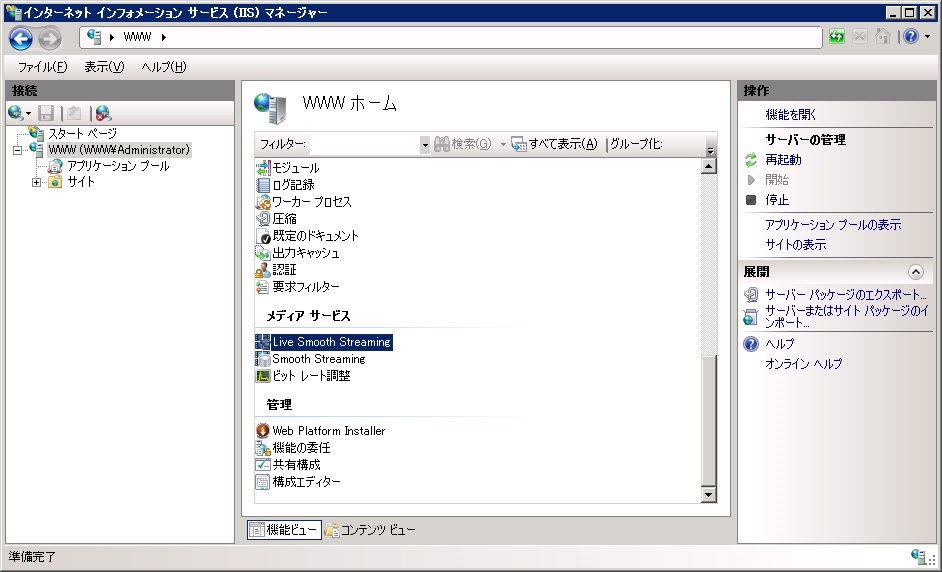次はいよいよ設定です。IIS マネージャーでメディアサービスが表示されているか確認しましょう。