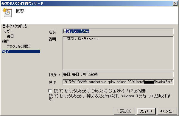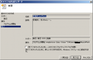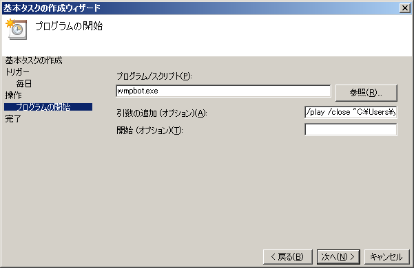 c:windowssystem32wmpbot.exe /play /close “C:UsersほげおMusicPerfumeGAME 6 マカロニ.wma” 入力