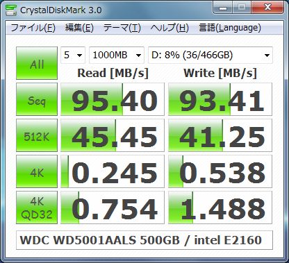 実家PCに2008年10月に発売され当時は平均的速度で安価な WDC WD5001AALS (500G / SATA300 7,200rpm / Cache 32MB) が格納されていたので CrystalDiskMark 3.0 で見てみました。