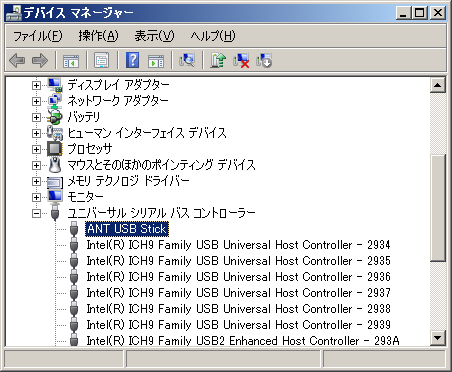 3. ANT USB Stick 認識動作確認をデバイスマネジャーで行います。