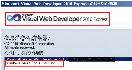 Windows Azure Tools Version 1.3 が確認できます。(Windows Azure でスケーラブルな Web アプリケーションおよびサービス の作成、構築、デバッグ、実行、およびパッケージ化を行うには、Visual Studio 2010 が必要です)