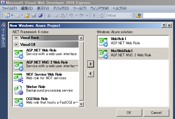 1.Microsoft Visual Web Developer 2010 Express で、新規 Azure プロジェクトをテンプレートから作成。基本的には Visual Studio 同様に .NET Freamrwork 4 から開発ソリューション対象に対して Web Role (役割)を与えます。これにより、単一のアプリ上で複数の機能を持たせられます。