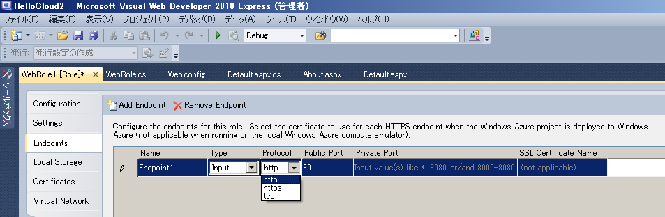 3.このように表示されるため、 WebRole Endpoints は http で接続する初期設定になっています(通常は意識しなくて構いません)