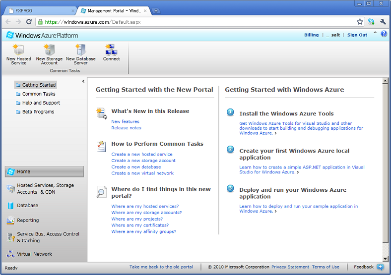 4. ここまでがローカル環境での開発で、コーディングと結合テスト前半までが終了していると仮定します。次に Winodws Azure へ乗せてみましょう。Windows AzurePlatform Portal (Azureポータルサイト :現在は英語版のみ)を開き、所定の手続き操作を行います。