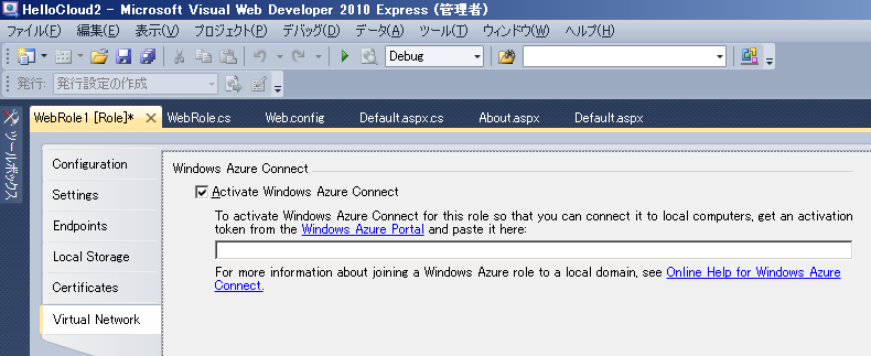 5. Azureポータルで発行されたトークンをアプリ側での Web Role / Virtual Networkで指定します。