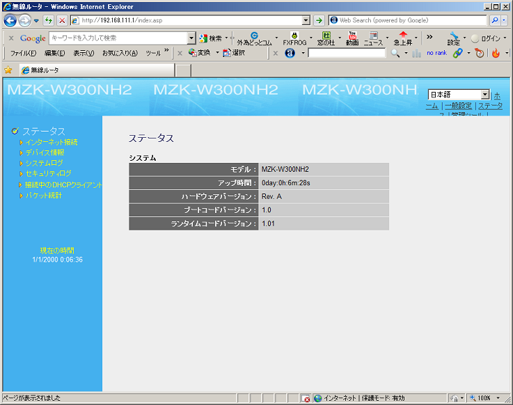 ■3.ステータス ⇒ システム で、ファームウェア(ここではランタイムコード)バージョンを見ると、1.01 なので最新ファームをダウンロードしてきて適用する。