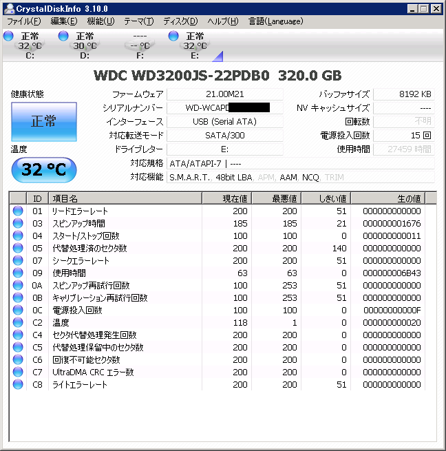 キンキンに冷やした外付けHDDドライブでは連続稼働 27,459時間のもの。