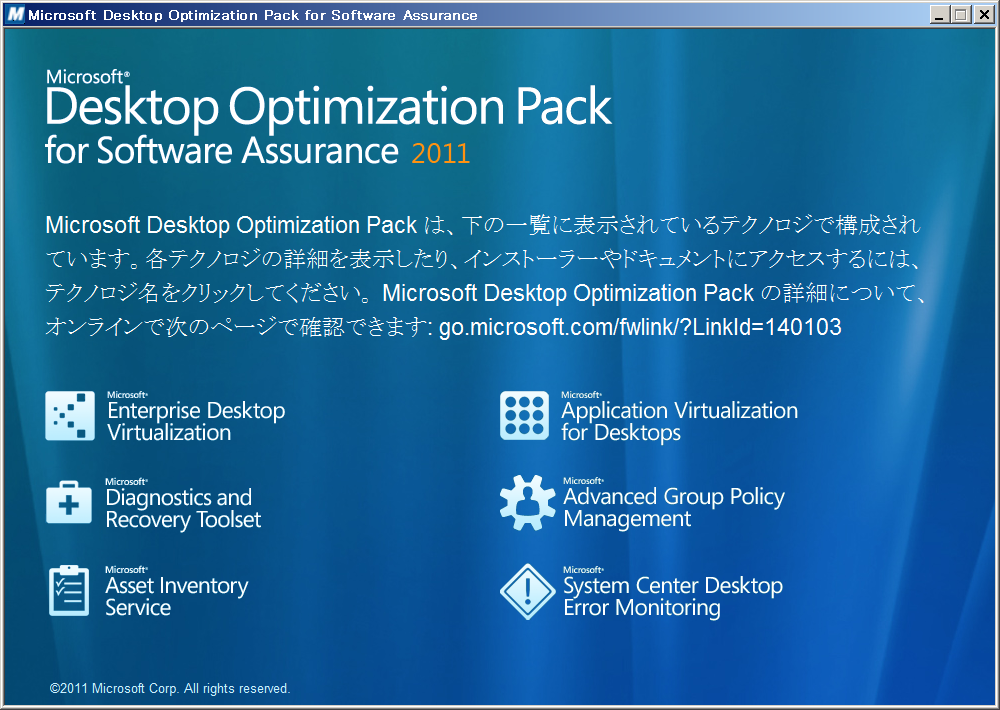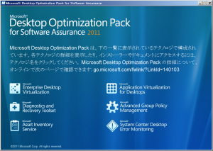 Technet Subscription より入手する。Microsoft Desktop Optimization Pack 2011 (x86 and x64) – DVD (Japanese) ファイルサイズ:2,219 (MB)