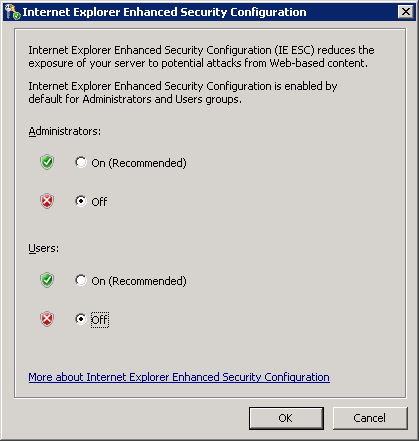 このリモートデスクトップ上で IE を多用するので、IEエンハンス・セキュリティコンフィグ (IE-ESC) から設定を無効化しておきます。(責任持たないので、各自の責任で!)