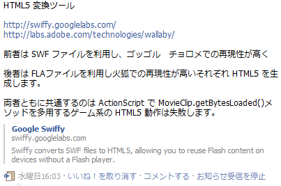 ↑swiffy が発表された2時間後くらいに facebook へ書いた内容。