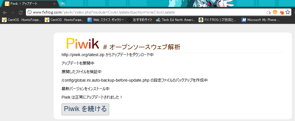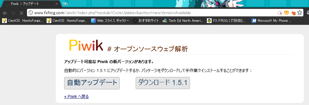 ■アップデート可能な Piwik の新バージョンがあるとのお知らせがありました。ここで「自動アップデート」を選択しました。