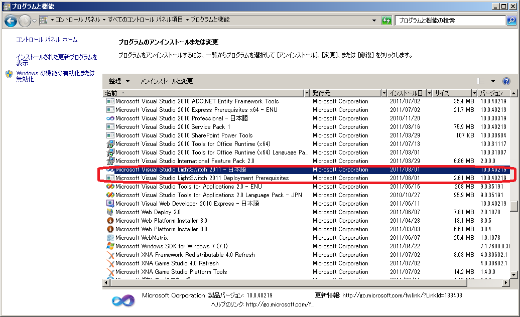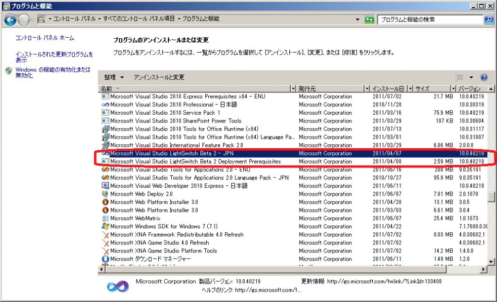 ■Microsoft Visual Studio LightSwitch Beta 2 を削除する手順