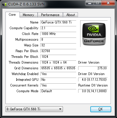 CUDA-Z Report ============= Version: 0.6.133 SVN Built Jun 24 2010 10:38:20 http://cuda-z.sourceforge.net/ OS Version: Windows AMD64 6.1.7601 Service Pack 1 Driver Version: 275.33 Driver Dll Version: 4.0 (8.17.12.7533) Runtime Dll Version: 3.0 (6,14,11,3000) Core Information ---------------- Name: GeForce GTX 560 Ti Compute Capability: 2.1 Clock Rate: 1800 MHz Multiprocessors: 8 Warp Size: 32 Regs Per Block: 32768 Threads Per Block: 1024 Threads Dimensions: 1024 x 1024 x 64 Grid Dimensions: 65535 x 65535 x 65535 Watchdog Enabled: Yes Integrated GPU: No Concurrent Kernels: Yes Compute Mode: Default Memory Information ------------------ Total Global: 961.562 MiB Shared Per Block: 48 KiB Pitch: 2048 MiB Total Constant: 64 KiB Texture Alignment: 512 B Texture 1D Size: 65536 Texture 2D Size: 65536 x 65535 Texture 3D Size: 2048 x 2048 x 2048 GPU Overlap: Yes Map Host Memory: Yes Error Correction: No Performance Information ----------------------- Memory Copy Host Pinned to Device: 164.404 MiB/s Host Pageable to Device: 156.472 MiB/s Device to Host Pinned: 164.396 MiB/s Device to Host Pageable: 156.318 MiB/s Device to Device: 38.7264 GiB/s GPU Core Performance Single-precision Float: 914.648 Gflop/s Double-precision Float: 115.108 Gflop/s 32-bit Integer: 459.414 Giop/s 24-bit Integer: 456.371 Giop/s Generated: Sun Sep 11 05:14:29 2011