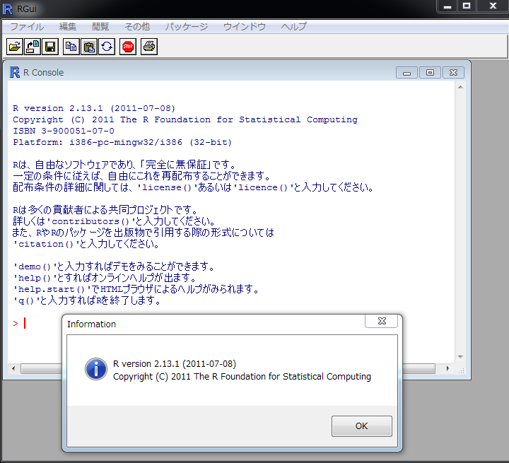 ■12.RGui をプログラムグループ R から起動して、バージョン情報を確認しましょう。