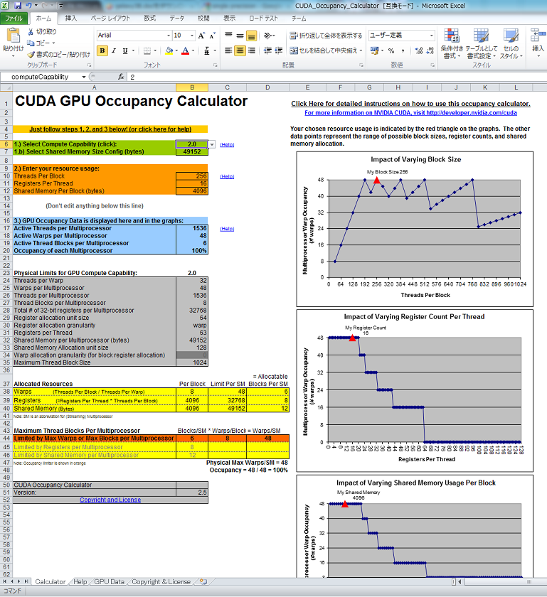 また、CUDA_Occupancy_Calculator.xls を使えば、deviceQueryで都度計算して目的デバイスを探すのではなく、リソース仮説計算にも使えます。