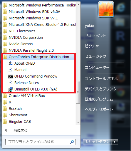 スタートメニューのプログラムグループに「 OpenFabrics Enterprise Distribution」があるので、OFED Command Window を起動ください。