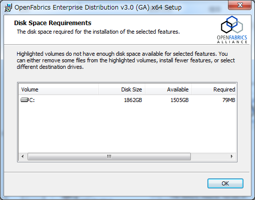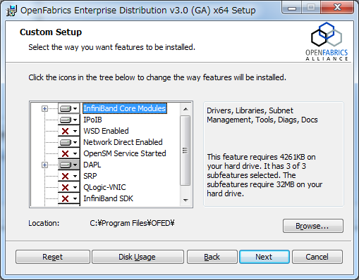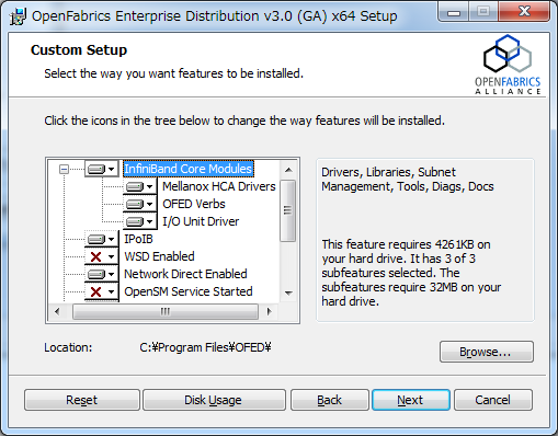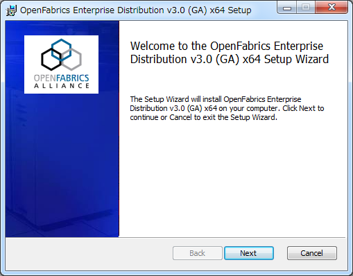 OFED_3-0_win7_x64.zip  17.9 MB (18,805,359 バイト) を圧縮解除し、インストーラを管理者権限で実行します。