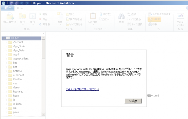 Web Platform Installer を起動して WebMatrix をアップグレードできませんでした。WebMatrix を閉じ、'http://www.microsoft.com/web/webmatrix' にアクセスすることで WebMatrix を手動でアップグレードできます。