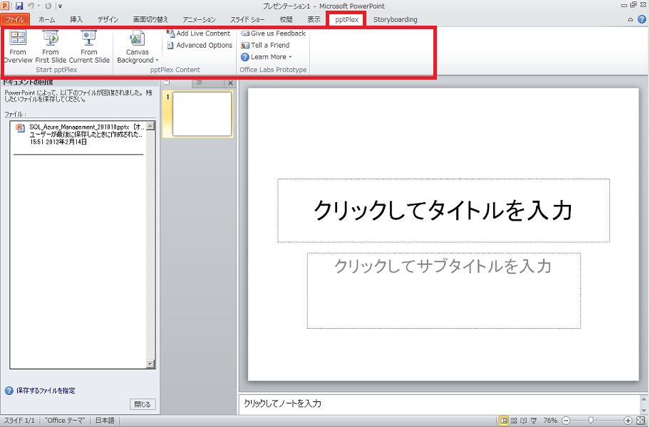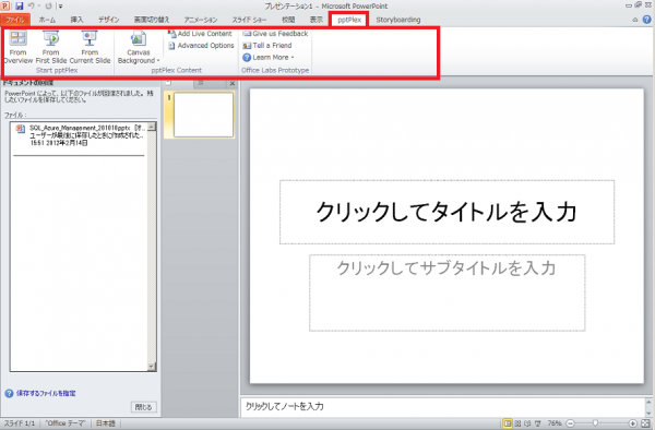 いつも通り PowerPoint 2010 を起動すると、pptPlex タブ(リボンタブ)が新たに追加されています。