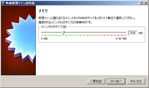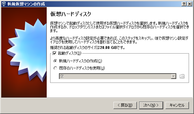 仮想ハードディスクのファイル格納場所とサイズ指定します。