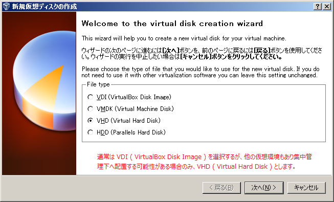 画像に注記した通り、他で管理検証を行う目的のため VHD を選択しています。