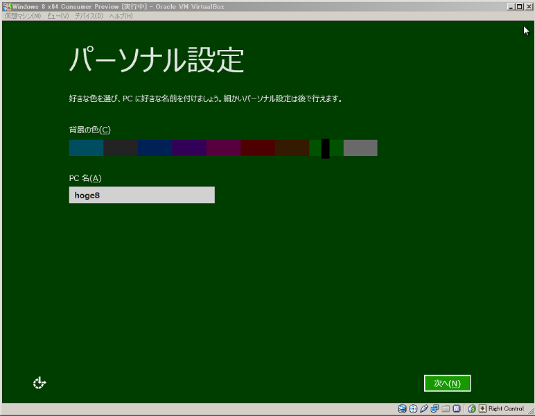 ここでは背景色をグリーン、PC名 hoge8 にしました。