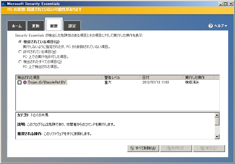 [IT] トロイの木馬を検出&検疫後の操作 - Microsoft Security Essentilas