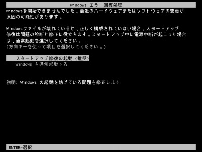 ■ Windows エラー回復処理 → 「スタートアップ修復の起動(推奨)」