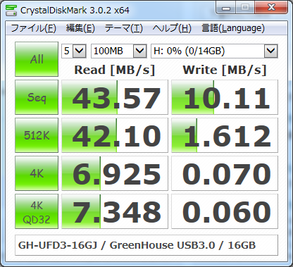 探した方がイケテないのか【GH-UFD3-16GJ / GreenHouse USB3.0 / 16GB】 ベンチマーク情報が見当たらなかったので、別作業しながら算出してみた。別作業しながらなので、これは概ね悪い値として見てもらえれば。