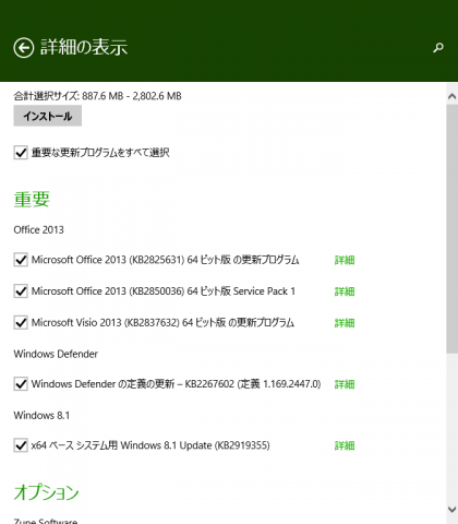 このマシンには Office 2013 と Zune  も入っているため複数の更新プログラムが表示されるが、基本的には