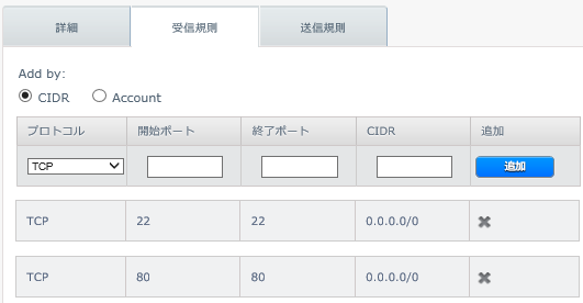 ■9. ネットワークタブから、CIDR ブロック(どこからでも 0.0.0.0/0)に対して受信設定を行う。受信設定には送信設定が必須という時代ではなく(もっと言うと、そんなアホな古い設計思想の仮想ファイアウォールが、この時代に現存するなら、プロトコルって何かを理解していない)、TCP#22 (ssh) , TCP80(http) を定義する。
