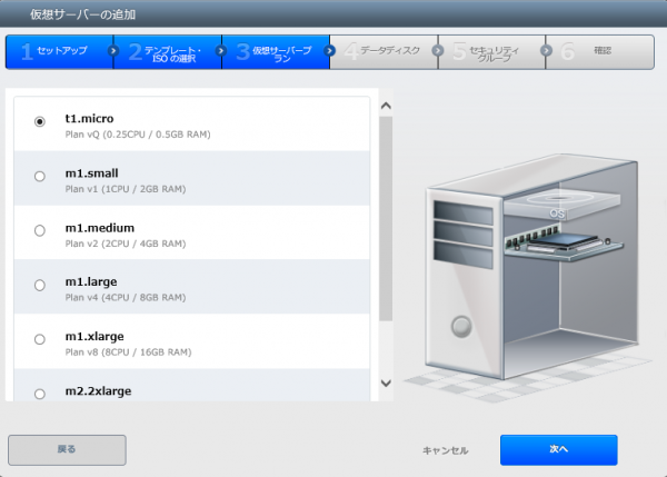 ■5. 仮想サーバープランは t1.micro (Plan vQ 0.25vCPU, 0.5GB 仮想RAM) を選択。