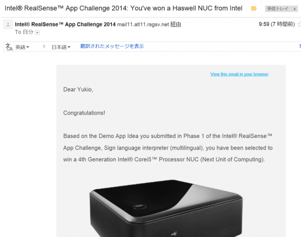2014/12/20(土)日本時間、午前に RealSense(TM) App Challenge 2014 からメール受信。