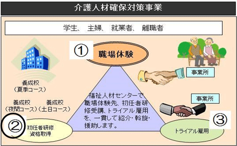 2) 介護職員初任者研修資格取得支援事業は、1) 職場体験事業の体験者が対象です。