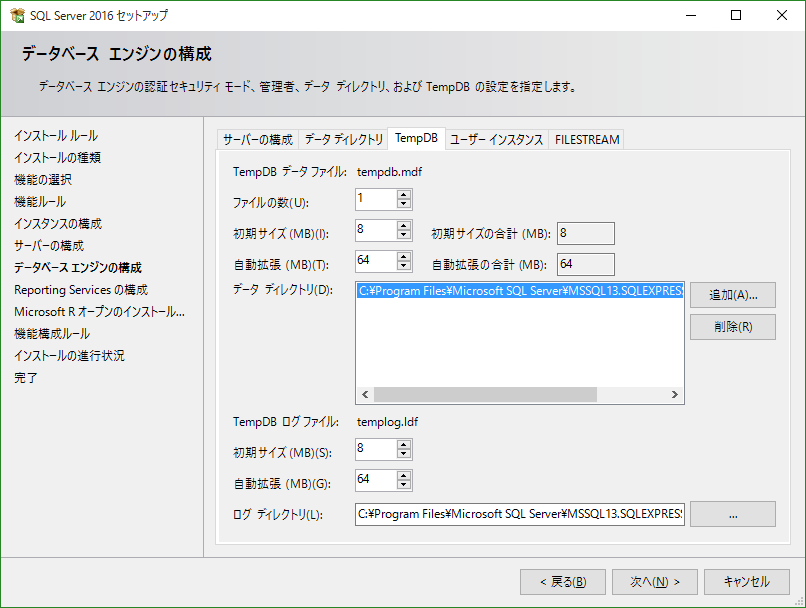ログディレクトリ: C:\Program Files\Microsoft SQL Server\MSSQL13.SQLEXPRESS\MSSQL\Data