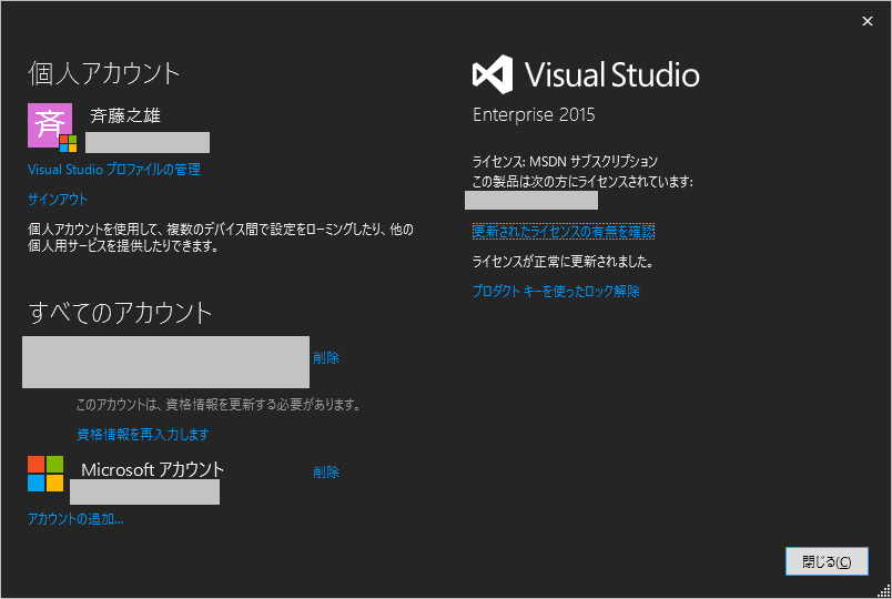 Microsoft Visual Studio ライセンス有効情報