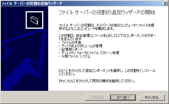 ◆今回評価目的の一つに、旧 CIFS プロトコルの遅さ、オーバーヘッドだらけで理想 NW 環境であっても、W2003 を継続利用する意味ないんじゃね?的な環境が必要なので「ファイルサーバーの役割の追加ウィザードの開始」をば。(IE セキュリティゆるゆる化済みの上で)