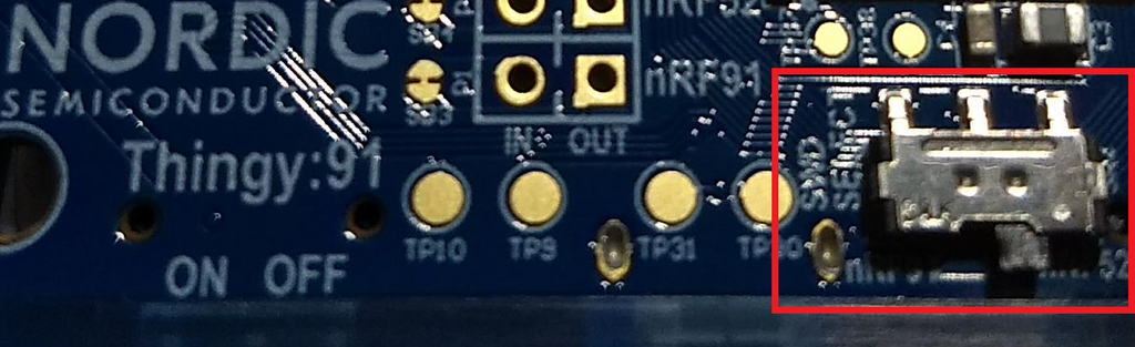 良い質問ですね。UART から AT コマンド?条件閾値によるマイコンからの割り込み制御?いいえ、物理スイッチです。赤枠で囲みました。左側が nRF91 (LTE-M) 、右側が nTF52 (BLE5) です。開発用リファレンスな緩い環境センサー付き GPS トラッカーと割り切ればいいでしょう。
