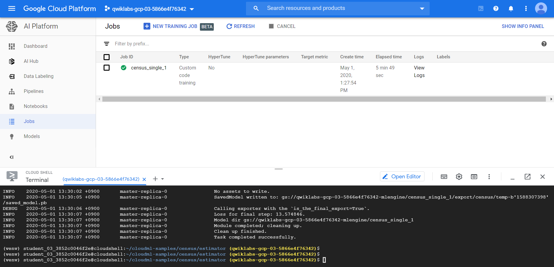 2020年5月1日 Baseline: Data, ML, AI ML Study Jams Vol.4 [ML Study Jams Vol.4] Baseline: Data, ML, AI / AI Platform: Qwik Start 受講メモ GSP076 Baseline…