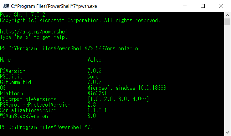 > $PSVersionTable を実行すると、7.0.2 と判明。
