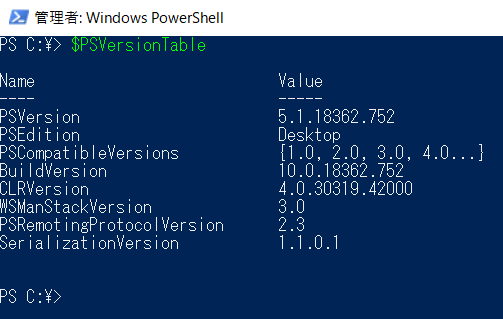> $PSVersionTable を実行すると、5.1.18362.752 と判明。