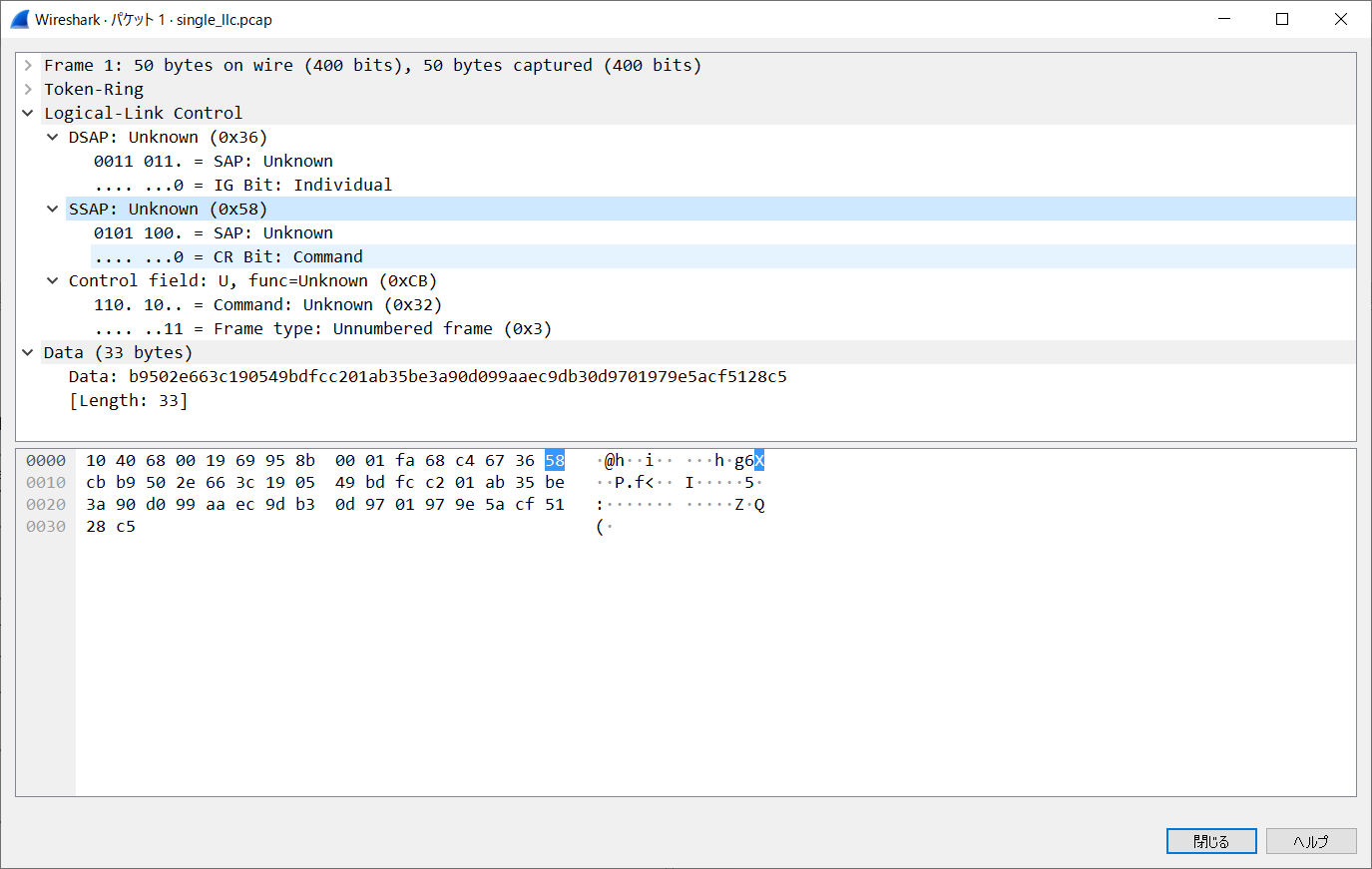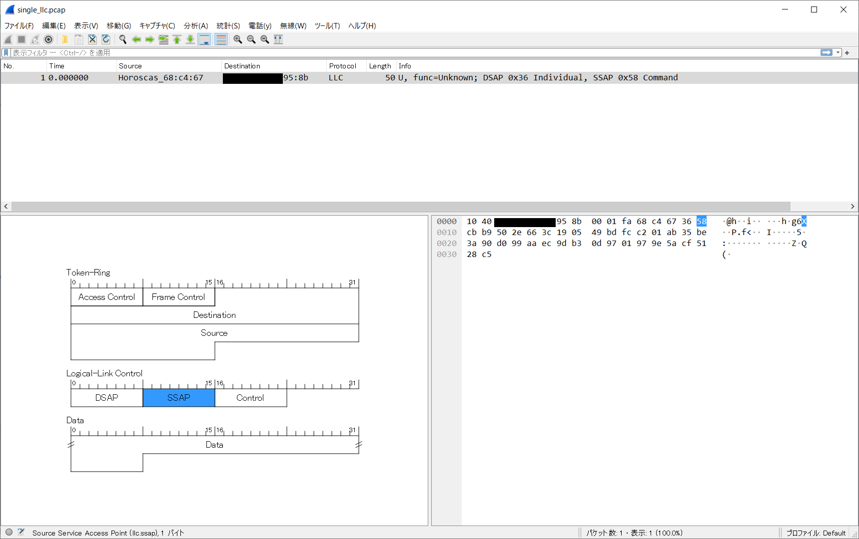 シングル LLC フレームを pcap 形式で生成したものを Wireshark で表示。