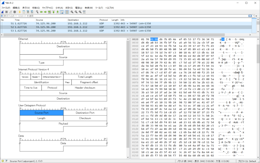 例としてパケットダイアグラム上 UDP Source Port をマウスオーバーで確認します。(Youtube を UDP#443 で受信)