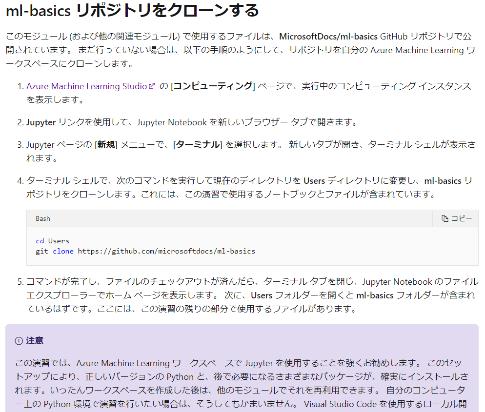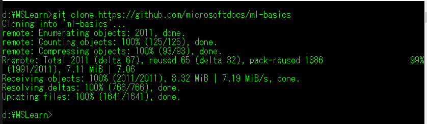 > git clone https://github.com/microsoftdocs/ml-basics を実行します。