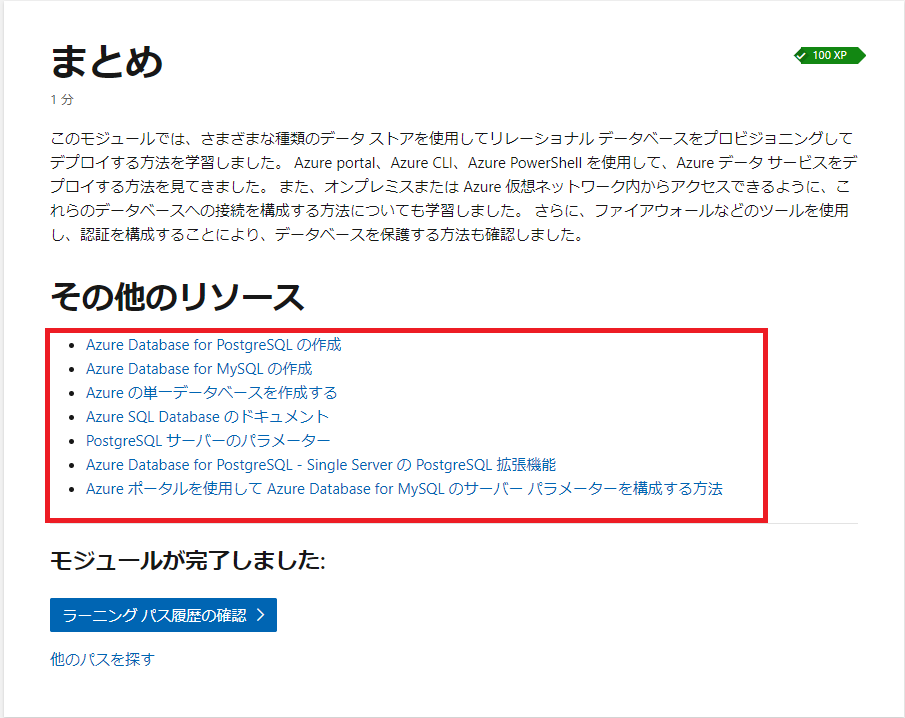 MSLearn で実技、小テストを終えると【まとめ】ページに到達します。ここで【モジュールが完了しました】にだけ目を進めてはイケません。重要な項目は敢えて赤枠を追記した【その他のリソース】箇所です。