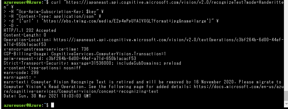 Operation-Location: https://japaneast.api.cognitive.microsoft.com/vision/v2.0/textOperations/c3bf264b-6d00-44ef-a71d-650b1acacf53