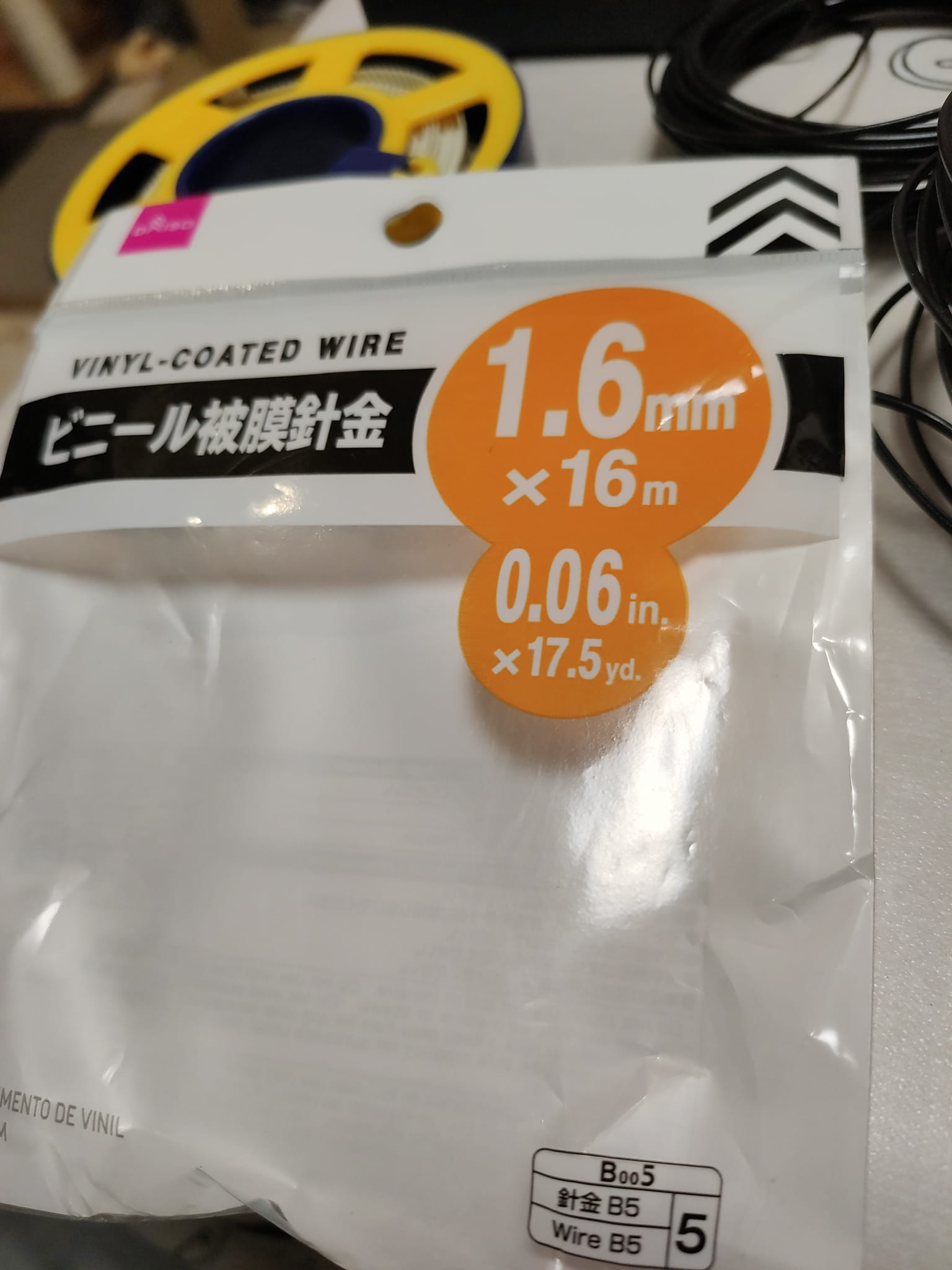 ビニール被膜針金 1.6mm x 16m を 2袋。市販されているものを購入する方もおられるようですが、カウンターポイズや同軸ケーブル(両端接栓)は自分で作ったほうが早くて安く、納得が出来ると思います。板金加工が必要なものは買う派です。