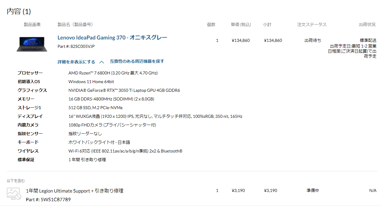 ※以前、Legion Y720 を購入した時に Ultimate 相当を契約しており、早期不具合(TFT モニター初期不良)からのサポートが丁寧だったことがあるので付けました。