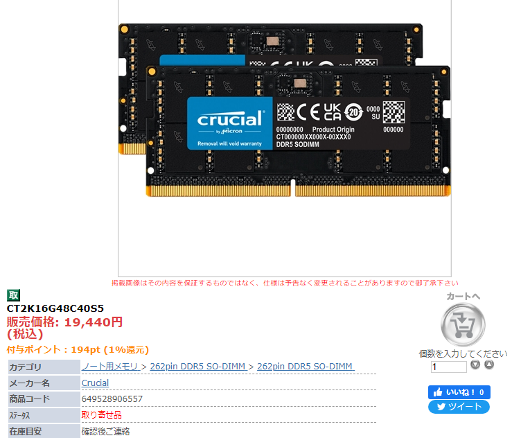 ・パーツ換装 (8GB × 2 DDR5 SODIMM はどこかショップで JPY 5K 程度になれば)